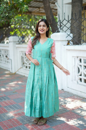 Woman wearing blue handwoven cotton kurti with woven motifs – Aayizhai Fashions.